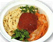 韓國泡菜 、小黃瓜絲、涼粉、芝麻、洋蔥絲、蒜米、蔥花